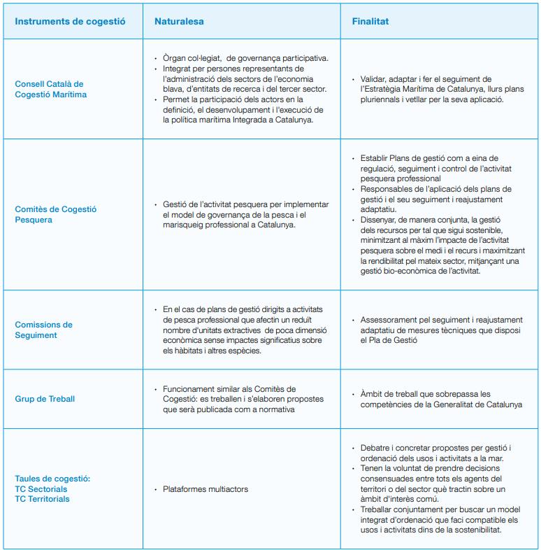 La constitució del Consell Català de Cogestió Marítima mereix una atenció més acurada, ja que amb la seva creació es posa en funcionament un model de governança per a la Política marítima integrada a Catalunya basat en la cogestió, l’expressió màxima de l’apoderament que confereix a tots els actors marítims del país a l’hora de confegir les polítiques públiques de l’economia blava del nostre país.