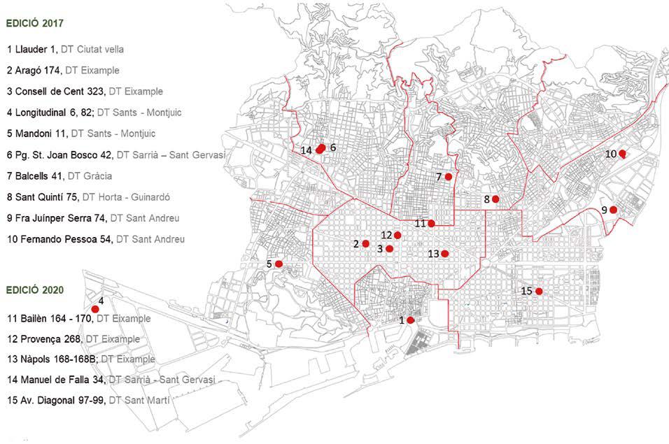De les 15 cobertes verdes guanyadores del concurs, 10 es varen construir en la primera edició (2017-2020) i 5 en la segona (2020-2022).
