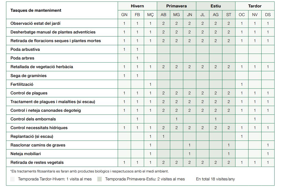 Una coberta verda no deixa de ser un jardí i, per tant, igual com un jardí convencional, necessita una planificació anual per garantir-ne la supervivència. A la taula 1 es detallen les tasques principals a dur a terme.