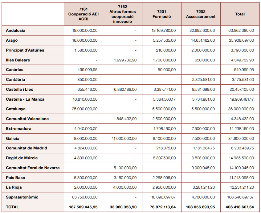 - 7161 Grups operatius de l’AEI AGRI: 187,51 M€ (gairebé totes les CA ho implementen i també a escala supraautonòmica)
