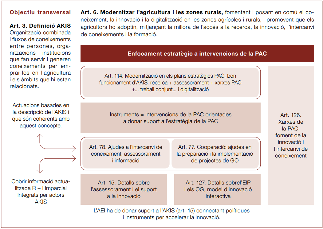 L’enfocament estratègic d’AKIS es tradueix a la pràctica mitjançant l’ús i la combinació de tres tipus d’intervencions del Reglament (UE) 2021/2115, que contribueixen en conjunt al bon funcionament d’AKIS.