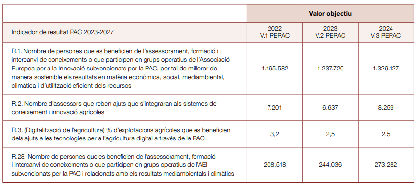A través de les intervencions del Pla estratègic, Espanya en el seu conjunt s’ha marcat una sèrie de valors objectiu en els indicadors de resultats associats a les intervencions que busquen generar un impacte al seu AKIS. Amb les successives modificacions del Pla estratègic, es pot veure com els valors objectiu han augmentat (taula 2).