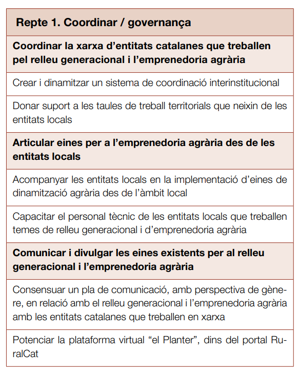 - Coordinar / governança: estructurar un sistema de suport i acompanyament interinstitucional per al relleu generacional i l’emprenedoria agrària. Coordinar tots els agents, entitats i institucions que donen suport, assessorament i acompanyament al procés de relleu generacional i emprenedoria agrària per treballar conjuntament en la mateixa direcció, sense duplicitat d’accions. Aquesta coordinació requerirà una governança que hauria de liderar l’òrgan competent, que és el Departament d'Agricultura, Ramaderia, Pesca i Alimentació (DARPA).
