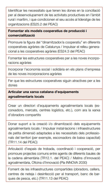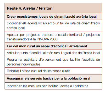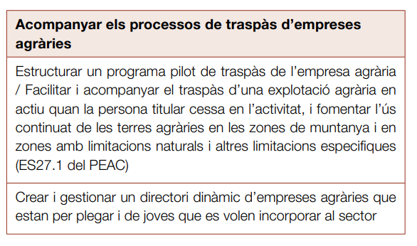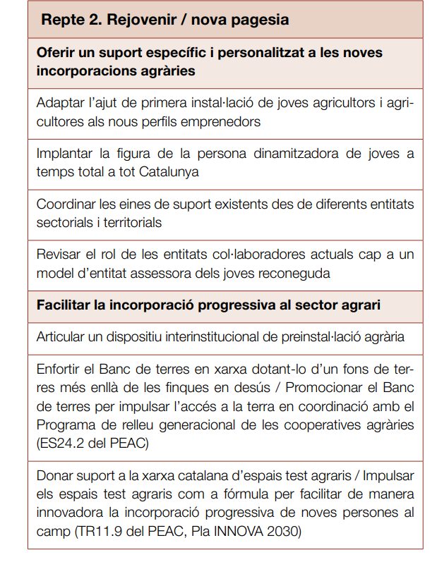 - Rejovenir / nova pagesia: facilitar l’accés, tant de la pagesia tradicional com de la nouvinguda, a empreses agràries viables econòmicament, socialment i ambientalment. Rejovenir el camp català amb un relleu generacional natural de les explotacions familiars, tot fomentant el traspàs d’explotacions que no tenen continuïtat familiar i la creació de noves empreses agràries que donen suport a una nova pagesia vinculada a la terra i a la producció sostenible local.
