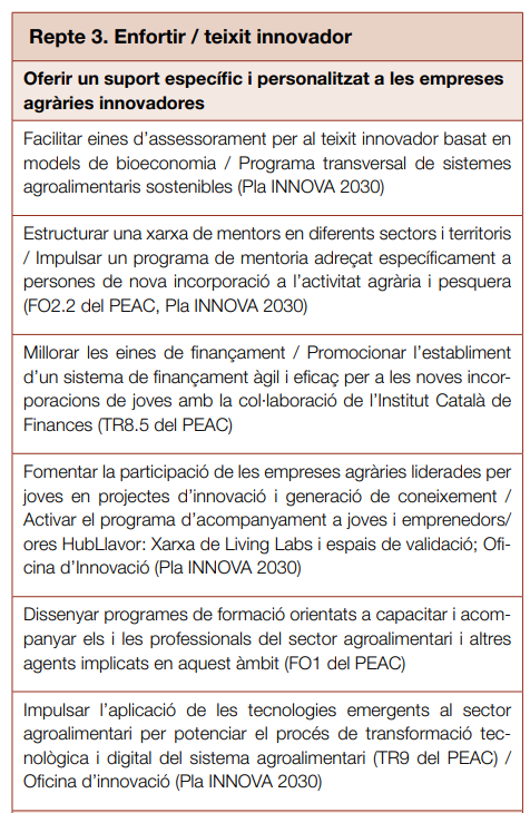- Enfortir / teixit innovador: acompanyar les empreses agràries amb models innovadors de producció i comercialització. Enfortir a les empreses agràries liderades per joves assessorant-les i acompanyant-les amb un suport específic i personalitzat tot creant teixit innovador basat en models agroalimentaris sostenibles i bioeconomia, integrant la perspectiva de gènere i fomentant models cooperatius, que incorporin els conceptes de la responsabilitat social.