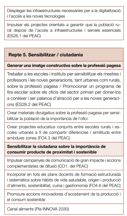 - Sensibilitzar / ciutadania: conscienciar la ciutadania del paper imprescindible de la pagesia i del seu vincle amb l’alimentació sostenible. Sensibilitzar del paper imprescindible de la pagesia com a productor d’aliments sostenibles, sans, de qualitat i proximitat, que és garant del territori, ja que té cura del medi ambient. I així, la ciutadania coneixerà la importància d’aquesta professió. Aquests reptes es basen en diversos 15 objectius i 48 accions, amb algunes accions interrelacionades també amb el Pla estratègic de l’alimentació de Catalunya 2021-2026 (PEAC) i amb el Pla INNOVA 2023, tal com es mostra a la taula 1.