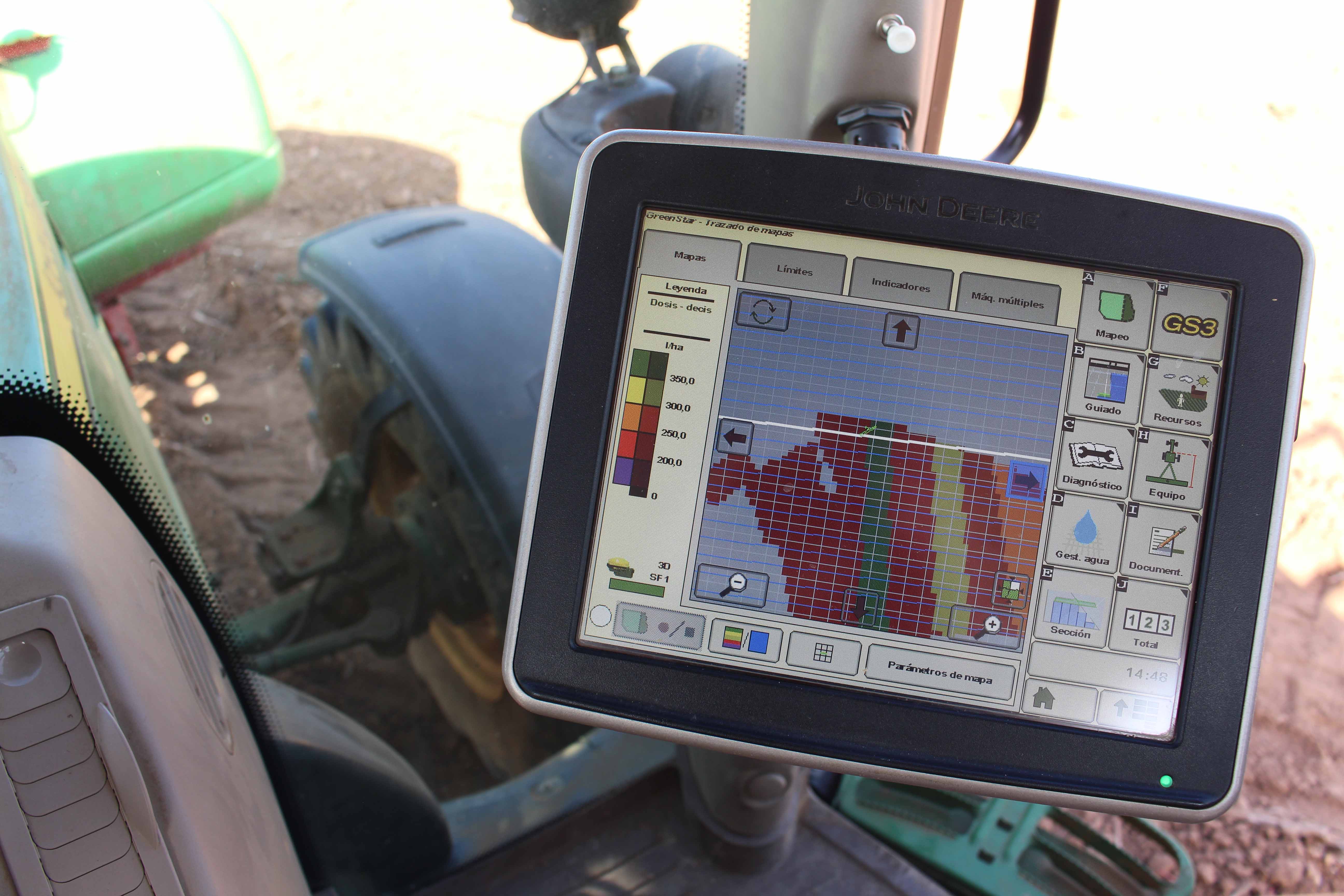 Finalment, per fer les aplicacions adaptades a aquestes recomanacions a mesura que es fa la aplicació de fertilitzants, és necessari disposar d’equips d’aplicació que puguin regular les dosis aplicades a mesura que es desplacen per la parcel·la. El mapa de prescripció digital s’ha d’introduir en la consola del tractor (Figura 2) que controla la maquinària d’aplicació de fertilitzants (sòlids o líquids) i, amb aquests equips, es pot realitzar una aplicació de dosi variable de fertilitzants segons la prescripció elaborada.
