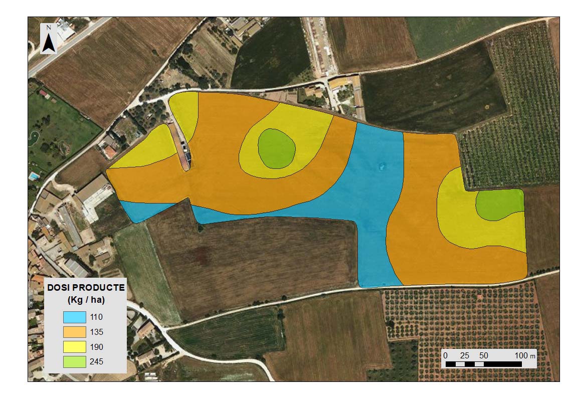 Amb aquesta informació es poden realitzar recomanacions de fertilització adaptades a aquesta variabilitat. Aquestes recomanacions es concreten en un mapa digital de prescripció de fertilització (Figura 1), adaptant el maneig del cultiu a cada sector, amb l’objectiu d’assolir la producció potencial del cultiu i reduir l’impacte ambiental.