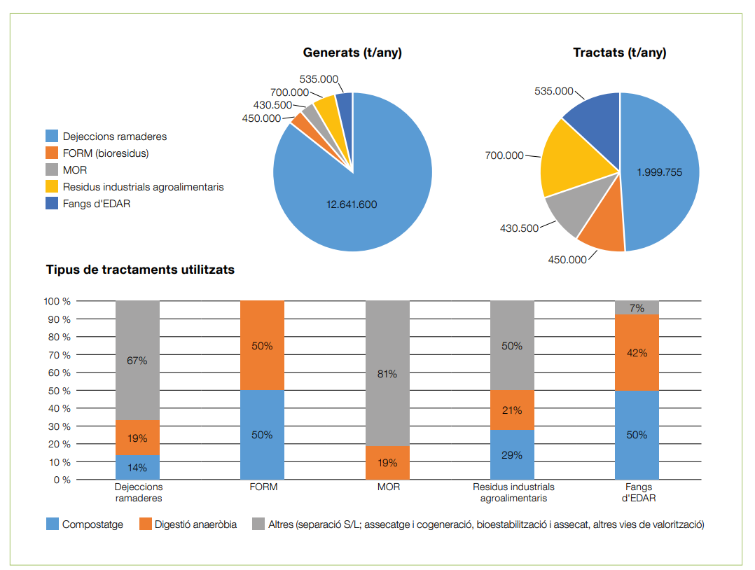 Entre aquests materials, les dejeccions ramaderes són el que es genera de forma més quantiosa a Catalunya. Es produeixen més de 12.000.000 de tones de dejeccions a l’any, i els purins de porc en són les més abundants. Unes 10.600.000 tones s’apliquen directament als camps, mentre que la resta són processades, principalment, en instal·lacions de compostatge i de digestió anaeròbia, o bé simplement separades en fraccions sòlida i líquida. Malgrat que les dejeccions tenen un elevat contingut d’aigua, també aporten nutrients (N, P, K, S, etc.) al sòl. A més, la seva capacitat tampó (resistència a la modificació del pH) afavoreix el seu ús en el procés de digestió anaeròbia, especialment quan es barregen amb d’altres residus orgànics (codigestió). Per tot això, són materials molt adients per a la producció de biogàs, mentre que l’aplicació agronòmica de les dejeccions digerides (digestats) millora la disponibilitat de nutrients i l’estabilitat de la matèria orgànica del sòl. En relació a la fracció orgànica de residus municipals (bioresidus), se’n recullen al voltant de 450.000 tones a l’any a Catalunya provinents de més de 800 municipis que tenen implantada la recollida selectiva. Aquestes tones es tracten en 25 plantes de compostatge, essent el compost produït un recurs valuós per l’agricultura. Quatre d’aquestes instal·lacions incorporen un procés previ de digestió anaeròbia. La resta de municipis, rurals i de mida petita, promouen l’autocompostatge, ja sigui a escala domèstica o comunitària. Aquests bioresidus, quan són de bona qualitat i sense impropis, faciliten el seu tractament i valorització i generen un compost de millor qualitat amb absència d’impureses i baixa presència de microplàstics.