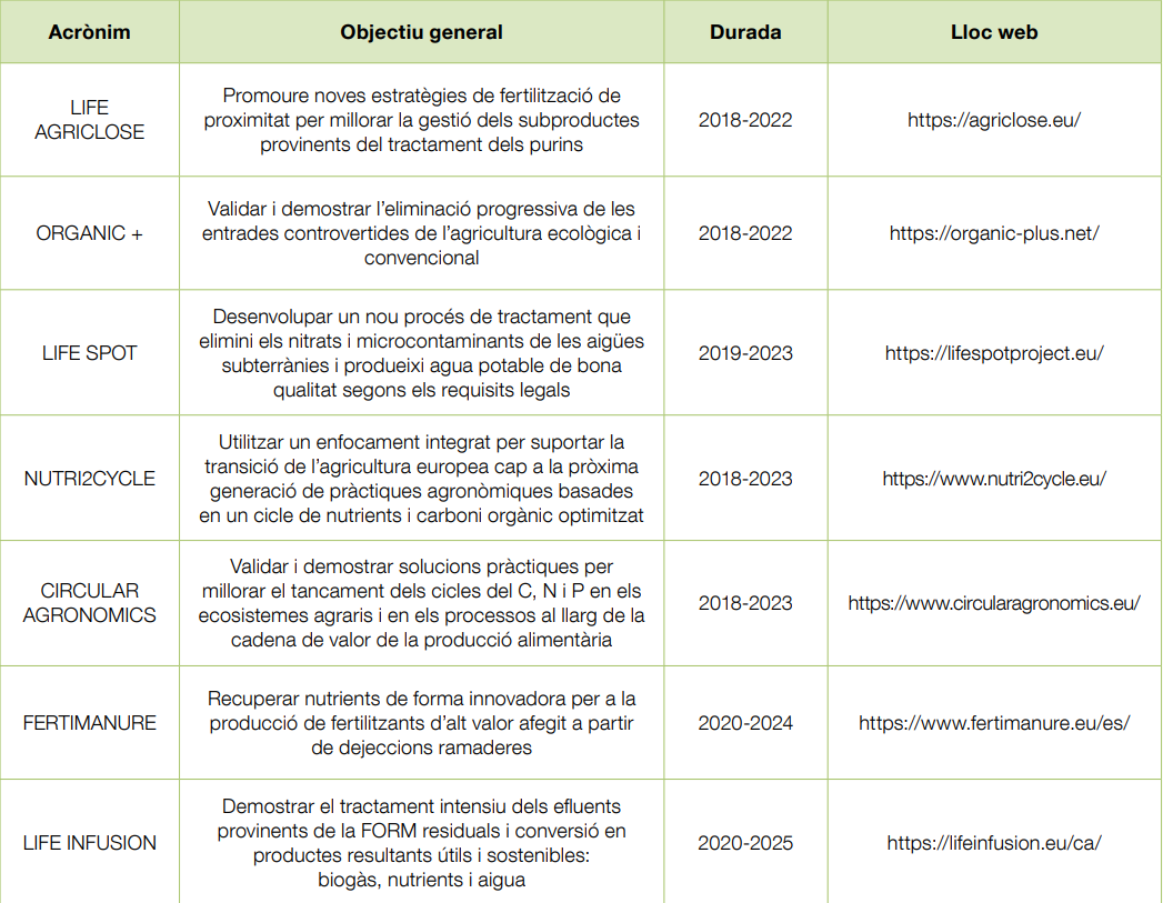 Aquests reptes han marcat els objectius dels projectes de recerca que s’han coordinat des de Catalunya durant els darrers anys. A la taula 1 es presenta un llistat d’alguns dels projectes més rellevants duts a terme en l’àmbit del tractament i gestió sostenibles de les dejeccions ramaderes i/o els residus orgànics.