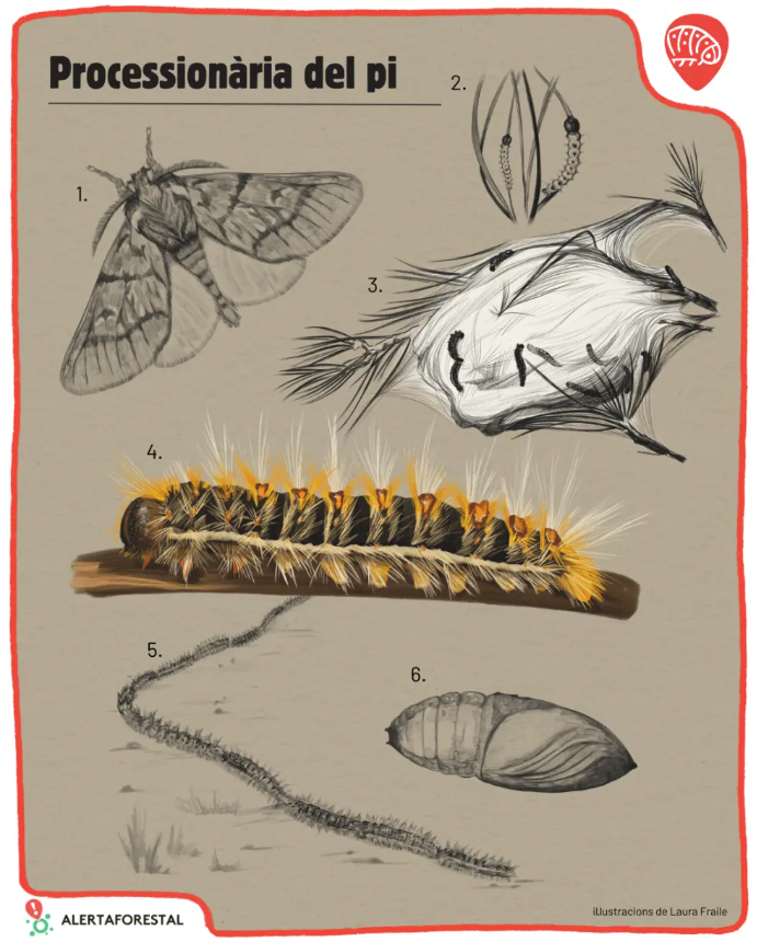 La processionària té un cicle vital complex i segueix la metamorfosis. Això vol dir que la papallona passa per diferents estadis, com totes les papallones. En primer lloc les erugues surten dels ous a la tardor i comencen a alimentar-se de forma massiva de les fulles dels pins. Quan arriba l’hivern amb les baixes temperatures que són letals per la processionària, comencem a veure el que semblen unes bosses fetes de teranyines blanques a dalt dels pins. Dins aquestes bosses s’hi refugien en grup les erugues per poder sobreviure el fred de l’hivern, i surten durant la nit per alimentar-se.