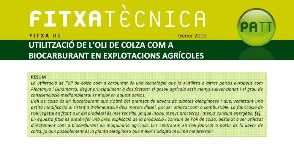 FT nº 8: Utilització de l'oli de colza com a Biocarburant en explotacions agrícoles