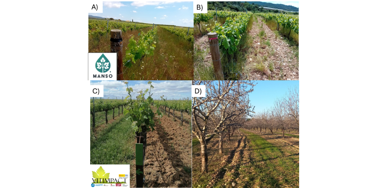 El projecte MANSO (Figura 1A i B), impulsat per INNOVI en col·laboració amb l’INCAVI, la Universitat Rovira i Virgili i empreses del sector vitivinícola del Penedès, pretén donar rigor científic sobre com gestionar el sòl, ja sigui mitjançant diferents tècniques de treball del sòl o coberta vegetal, en una zona altament afectada per la sequera, per minimitzar els efectes de les èpoques de sequera en els ceps. El projecte VITIMPACT combina diferents estratègies de reg, de maneig de capçada i de maneig del sòl (coberta verda o llaurat) a la zona de viticultura de regadiu de Raïmat (Figura 1C), per avaluar la interacció entre el maneig del sòl, el reg i el maneig de capçada en l’estat hídric, avaluant els components del rendiment de collita i la qualitat del most. D’altra banda, en el projecte RegenAlmond (Figura 1D) s’avalua la interacció entre el cultiu de l’ametller i la coberta verda pel que fa a relacions hídriques a la zona del Penedès, amb reg de suport.