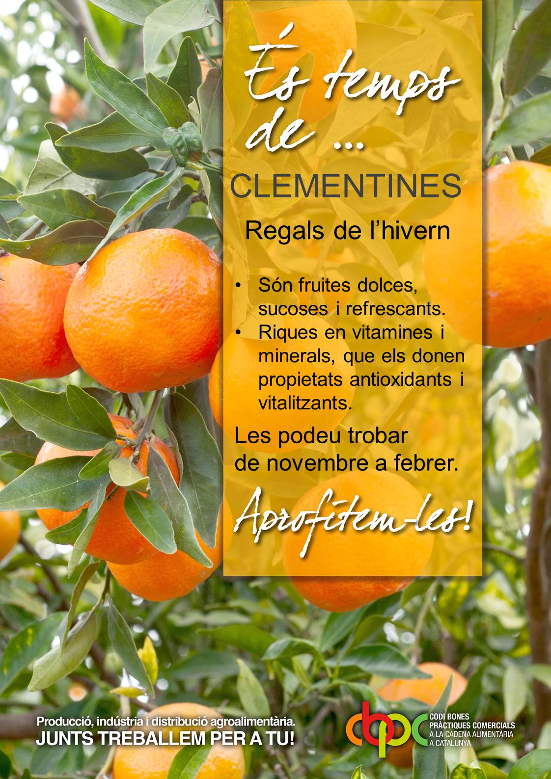 Les entitats signants de l’Acord del Codi de Bones Pràctiques Comercials al llarg de la Cadena Alimentària a Catalunya (CBPC), en col·laboració amb el Departament d’Agricultura, Ramaderia, Pesca i Alimentació (DARPA), han posat en marxa una nova campanya de promoció de la clementina amb l’objectiu de millorar-ne la percepció i impulsar-ne el consum.