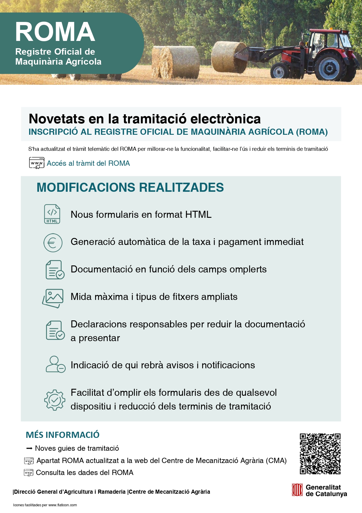 A banda, per facilitar el nou tràmit s’han elaborat noves guies de tramitació per cada modalitat del tràmit, s’ha actualitzat l’apartat del ROMA a la pàgina web del Centre de Mecanització Agrària del DARPA i s’ha facilitat l’accés a les dades del ROMA per consultar les màquines registrades.