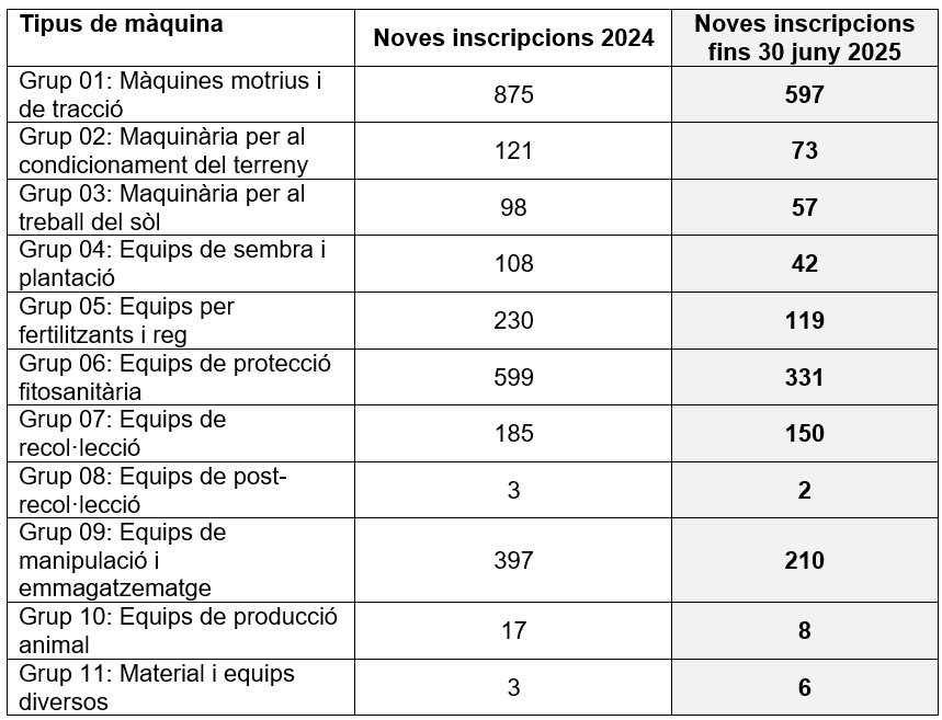 L’any 2024 es van inscriure més de 2.600 màquines noves al ROMA amb una valor d’inversió de més de 129 M€. Fins al mes de juny de 2025 ja s’han inscrit quasi 1.600 màquines noves el que representa un increment del 18% respecte al mateix període de l’any anterior. Les principals màquines noves es corresponent principalment a tractors (37%) i equips de protecció fitosanitària (20%).