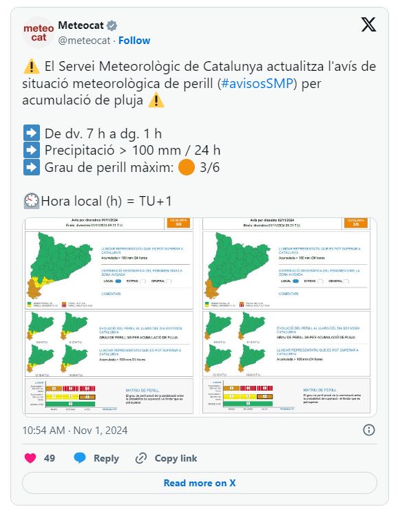 "El SMC treballa en coordinació amb Protecció Civil que serà qui activarà o no els corresponents plans d'emergència en cas de previsió de situacions meteorològiques de perill".