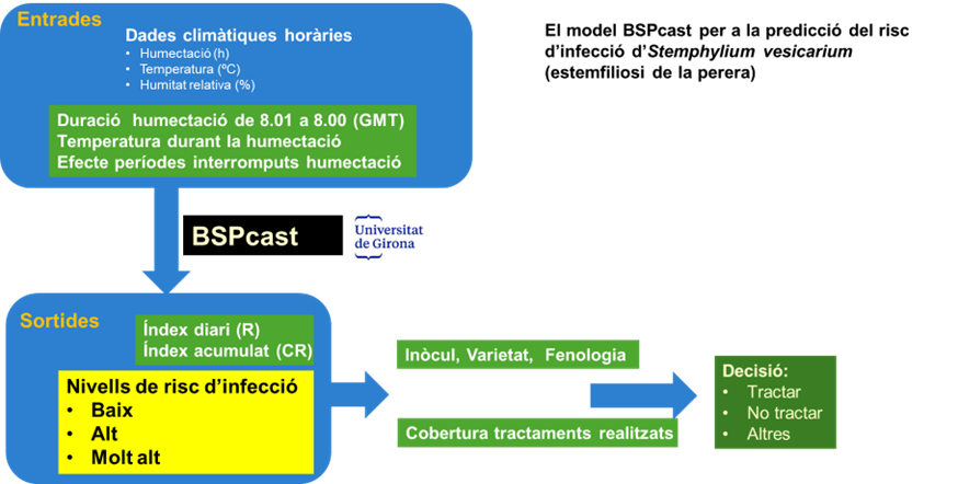 Figura 1. Esquema del funcionament del model BSPcast per a la predicció del risc d'infecció d’Stemphylium vesicarium, causant de l'estemfiliosi de la perera.