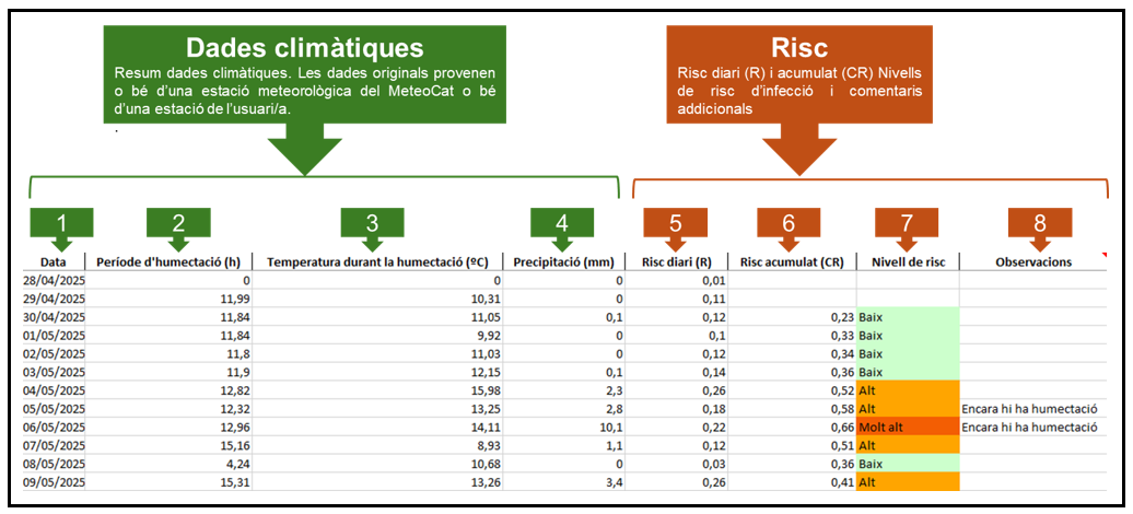 4. Observacions: en aquesta columna s’informa si en el moment de la lectura a les 8:00 h (GMT) encara hi ha humectació. Normalment, els períodes d’humectació són deguts a la rosada i passen durant la nit; l’endemà al matí a les 8:00h, que és el moment en què s’acaba el període de 24 hores, aquesta rosada ja ha desaparegut i no hi ha humectació. Tot i això, sota algunes condicions podria ser que en aquest moment encara hi hagués presència d’humectació. Si això passa, l’algoritme ho detecta i avisa l’usuari, amb el missatge següent: “La darrera lectura de la sonda d’humectació per al càlcul del risc indica que encara hi ha humectació, el que significa que el risc d’infecció real pot ser lleugerament superior al que es prediu.”