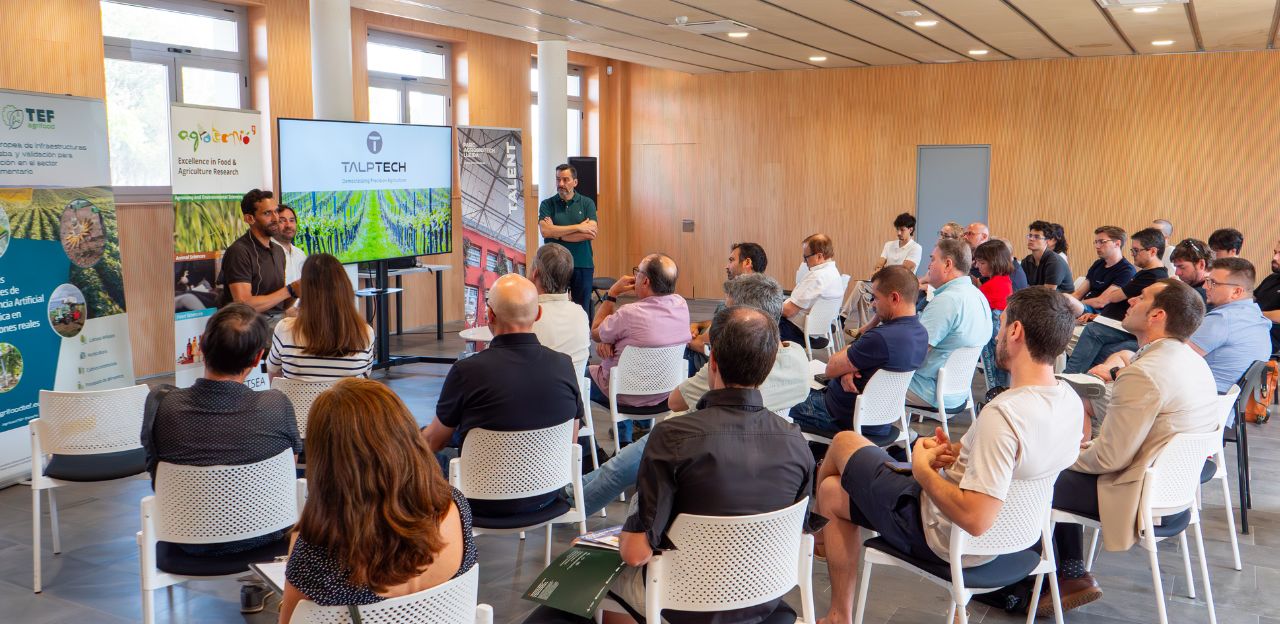 L’empresa emergent Talptech, spin-off del Barcelona Supercomputing Center (BSC) - i amb oficina al Parc Agrobiotech - ha presentat les seves solucions digitals per al monitoratge i maneig de cultius de precisió. La companyia desenvolupa sistemes avançats que permeten caracteritzar individualment cada planta i aplicar-hi, en temps real, dosis personalitzades de productes. “El nostre objectiu és transformar la manera com s'apliquen els productes al camp: passem de sistemes genèrics a solucions precises i eficients que no alteren la rutina de l’agricultor”, ha explicat el CTO de Talptech, Eduard Quiñones. El sistema de Talptech integra càmeres, sensors, computació al límit (edge computing) i anàlisi al núvol per generar dades sobre vigor, càrrega de fruit, mapes de tractament i prediccions de collita, tot assegurant la traçabilitat i compatibilitat amb la majoria de tractors. Aquesta tecnologia permet ajustar els productes a cada planta, monitorar el creixement i vigor dels cultius, estimar el rendiment de la collita i gestionar millor els recursos, amb una reducció de costos notable. El producte està en fase d’experimentació i es preveu llençar al mercat a finals d’any.
